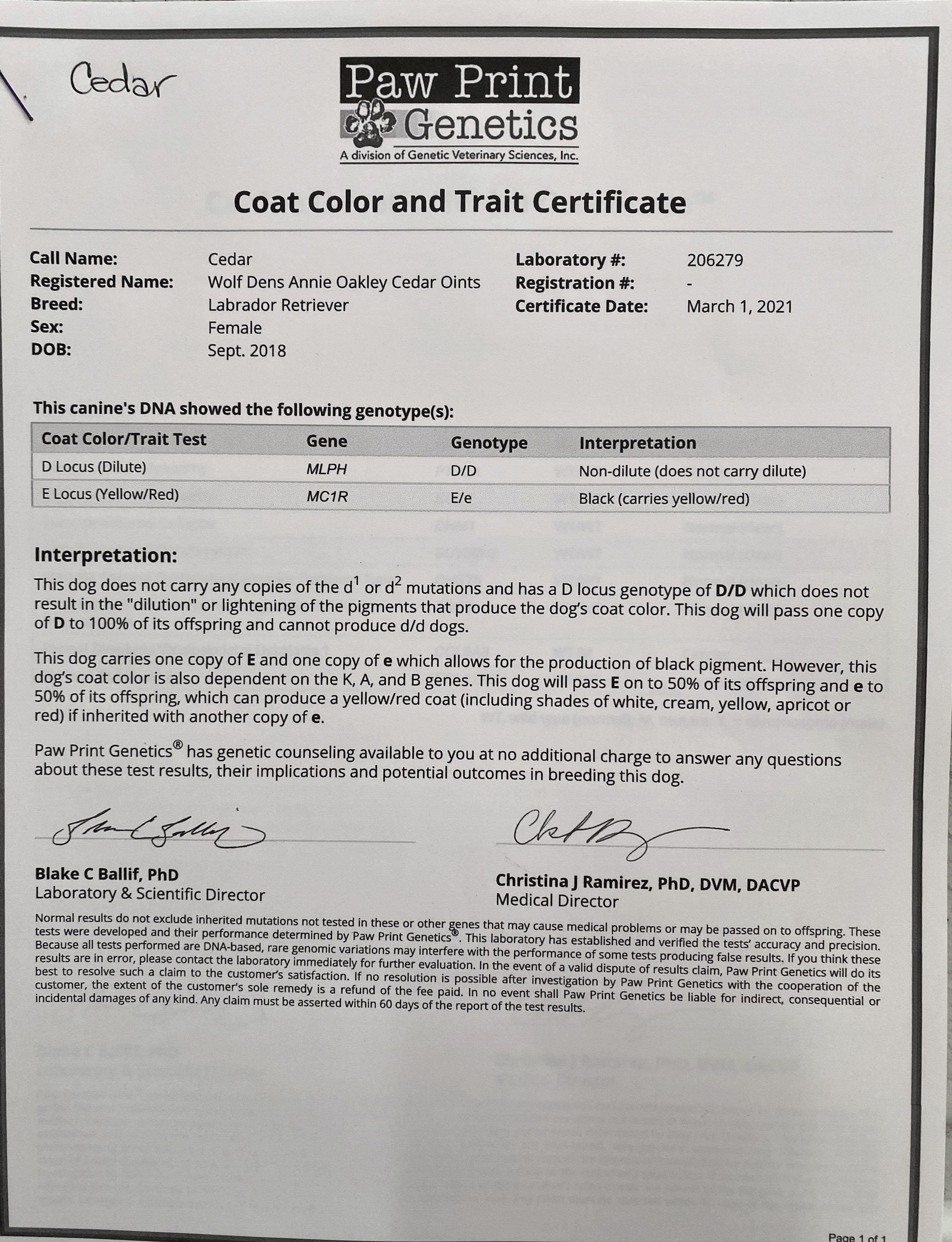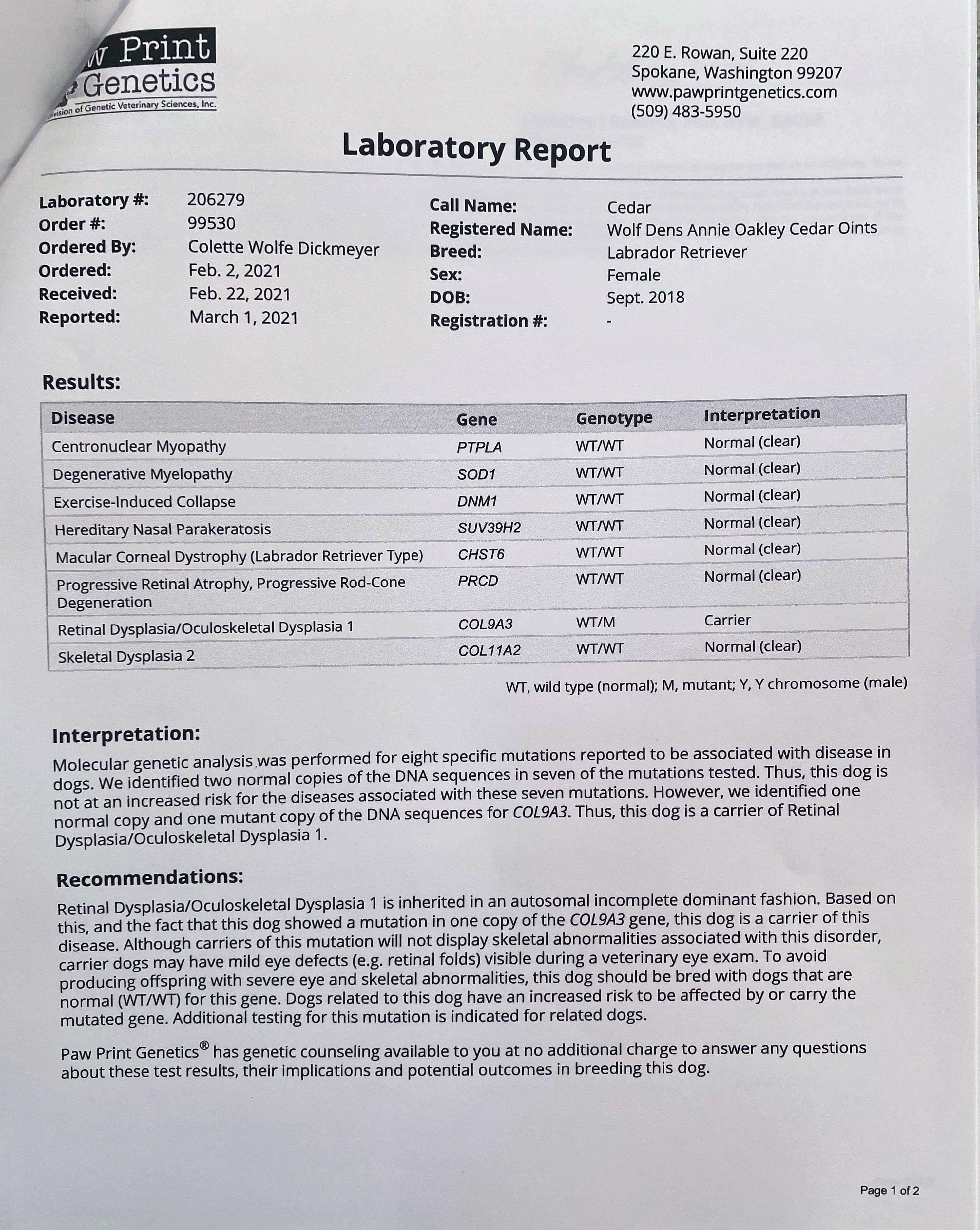 Pawprint Genetics Pawprint Lab. Report Cedar's Pedigree